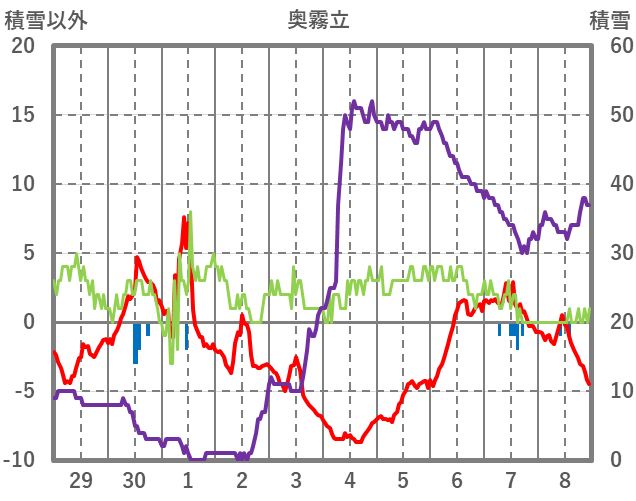 | 日 | 時 | 気温 | 降水 | 風向/風速 | 日照 | 積雪 | 降雪 |
