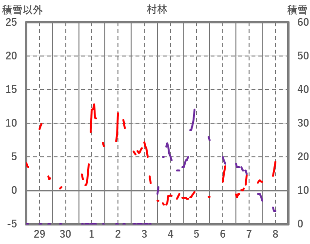 | 日 | 時 | 気温 | 降水 | 風向/風速 | 日照 | 積雪 | 降雪 |