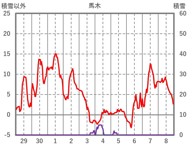 | 日 | 時 | 気温 | 降水 | 風向/風速 | 日照 | 積雪 | 降雪 |