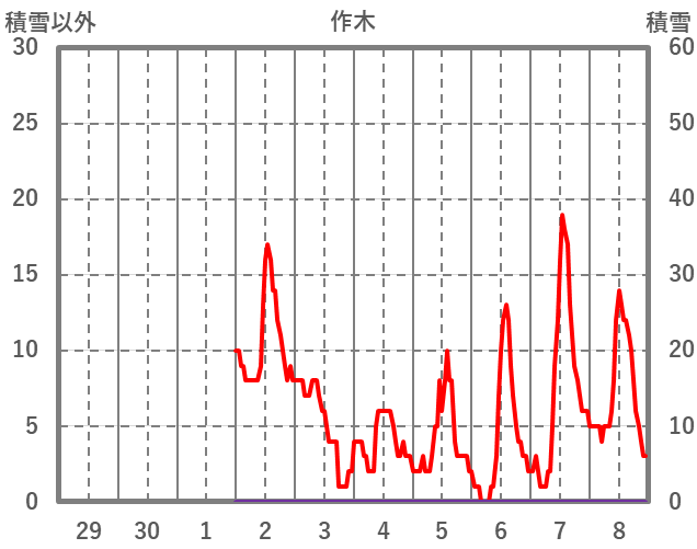 | 日 | 時 | 気温 | 降水 | 風向/風速 | 日照 | 積雪 | 降雪 |