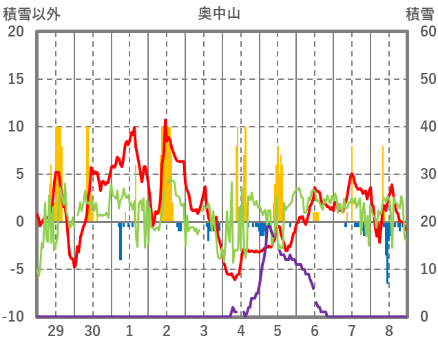 | 日 | 時 | 気温 | 降水 | 風向/風速 | 日照 | 積雪 | 降雪 |