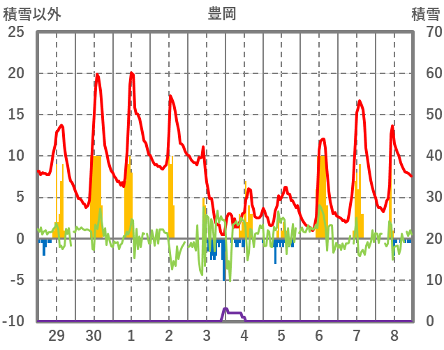 | 日 | 時 | 気温 | 降水 | 風向/風速 | 日照 | 積雪 | 降雪 |