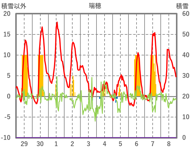 | 日 | 時 | 気温 | 降水 | 風向/風速 | 日照 | 積雪 | 降雪 |