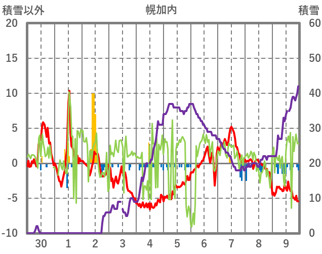 | 日 | 時 | 気温 | 降水 | 風向/風速 | 日照 | 積雪 | 降雪 |