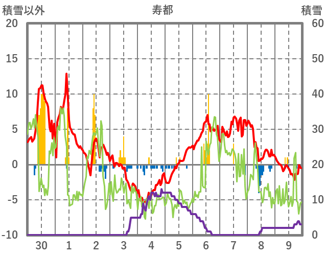 | 日 | 時 | 気温 | 降水 | 風向/風速 | 日照 | 積雪 | 降雪 |