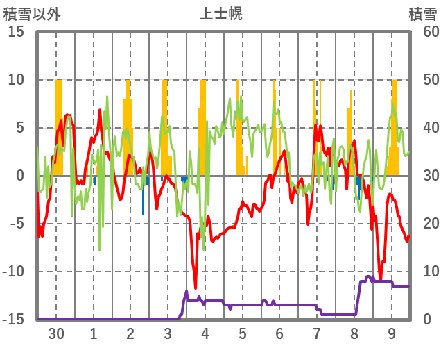 | 日 | 時 | 気温 | 降水 | 風向/風速 | 日照 | 積雪 | 降雪 |
