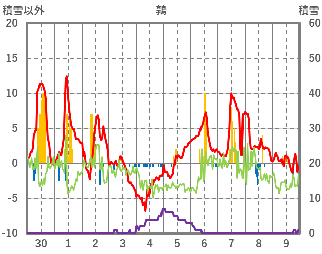 | 日 | 時 | 気温 | 降水 | 風向/風速 | 日照 | 積雪 | 降雪 |