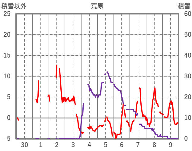 | 日 | 時 | 気温 | 降水 | 風向/風速 | 日照 | 積雪 | 降雪 |