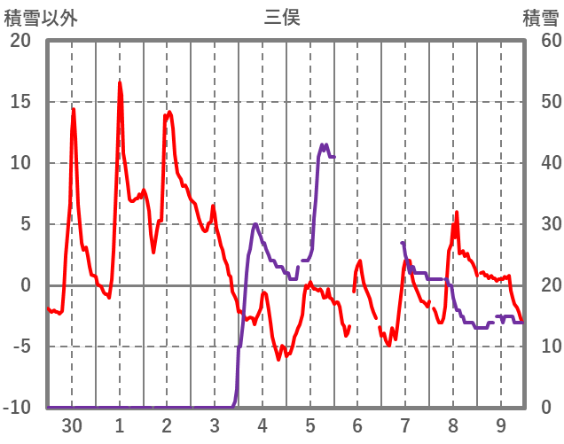 | 日 | 時 | 気温 | 降水 | 風向/風速 | 日照 | 積雪 | 降雪 |