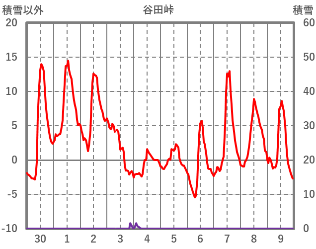 | 日 | 時 | 気温 | 降水 | 風向/風速 | 日照 | 積雪 | 降雪 |