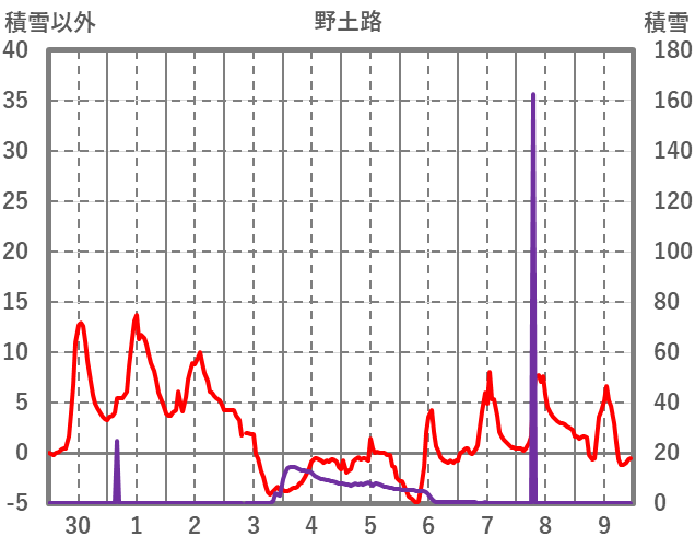 | 日 | 時 | 気温 | 降水 | 風向/風速 | 日照 | 積雪 | 降雪 |