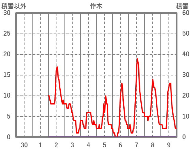 | 日 | 時 | 気温 | 降水 | 風向/風速 | 日照 | 積雪 | 降雪 |