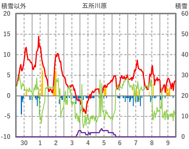 | 日 | 時 | 気温 | 降水 | 風向/風速 | 日照 | 積雪 | 降雪 |