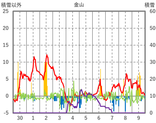 | 日 | 時 | 気温 | 降水 | 風向/風速 | 日照 | 積雪 | 降雪 |