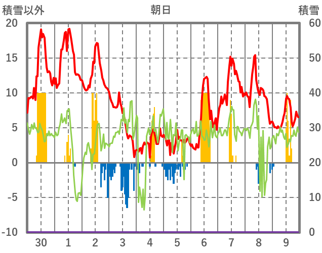 | 日 | 時 | 気温 | 降水 | 風向/風速 | 日照 | 積雪 | 降雪 |