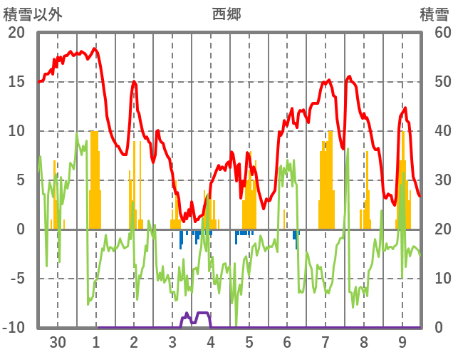 | 日 | 時 | 気温 | 降水 | 風向/風速 | 日照 | 積雪 | 降雪 |