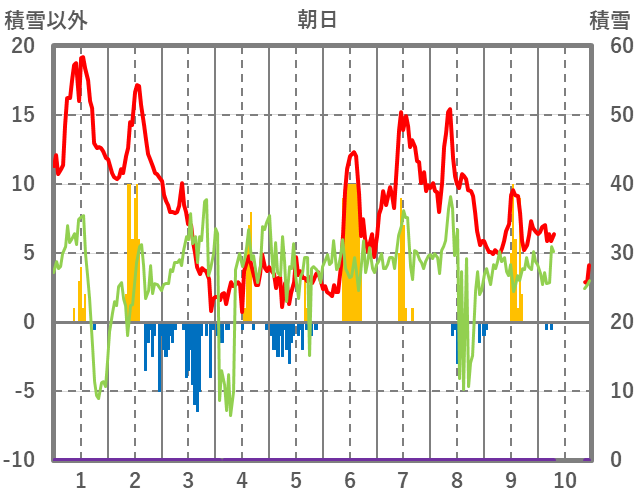 | 日 | 時 | 気温 | 降水 | 風向/風速 | 日照 | 積雪 | 降雪 |