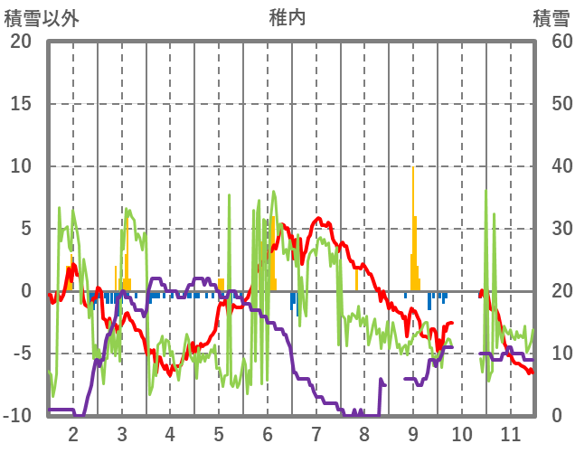 | 日 | 時 | 気温 | 降水 | 風向/風速 | 日照 | 積雪 | 降雪 |
