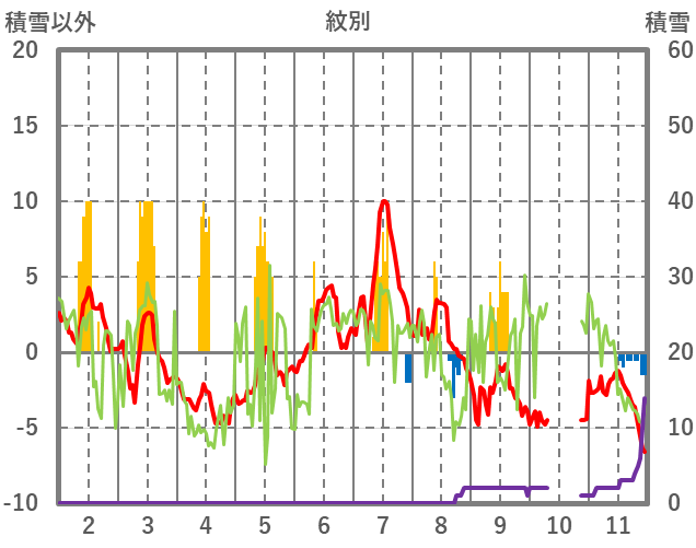 | 日 | 時 | 気温 | 降水 | 風向/風速 | 日照 | 積雪 | 降雪 |