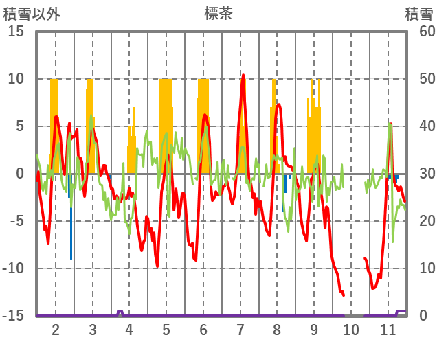 | 日 | 時 | 気温 | 降水 | 風向/風速 | 日照 | 積雪 | 降雪 |