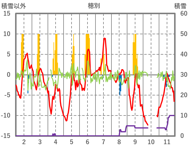 | 日 | 時 | 気温 | 降水 | 風向/風速 | 日照 | 積雪 | 降雪 |