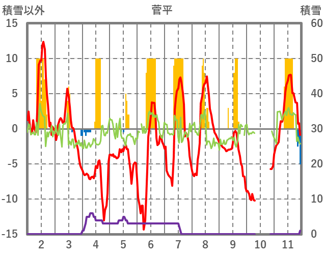 | 日 | 時 | 気温 | 降水 | 風向/風速 | 日照 | 積雪 | 降雪 |