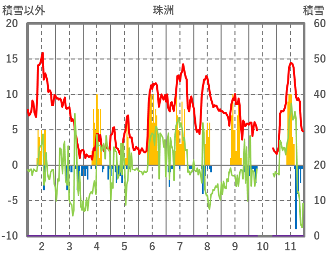 | 日 | 時 | 気温 | 降水 | 風向/風速 | 日照 | 積雪 | 降雪 |