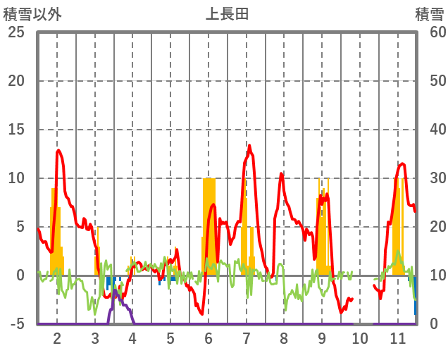 | 日 | 時 | 気温 | 降水 | 風向/風速 | 日照 | 積雪 | 降雪 |