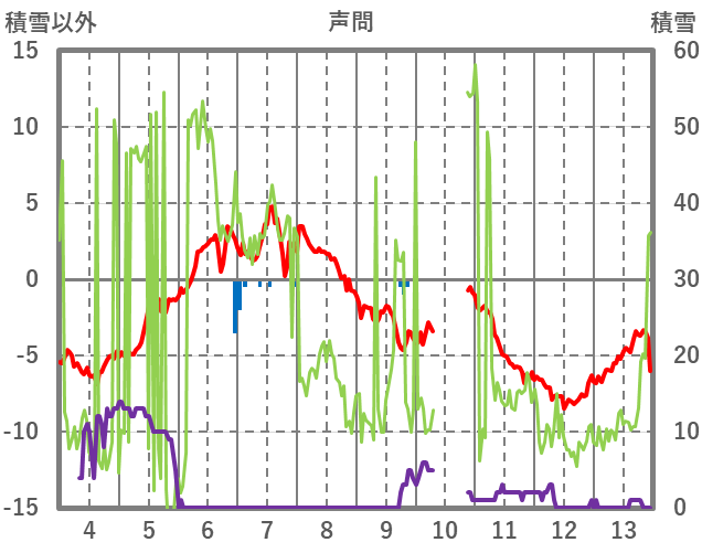 | 日 | 時 | 気温 | 降水 | 風向/風速 | 日照 | 積雪 | 降雪 |