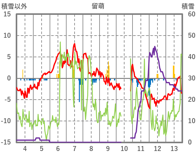 | 日 | 時 | 気温 | 降水 | 風向/風速 | 日照 | 積雪 | 降雪 |