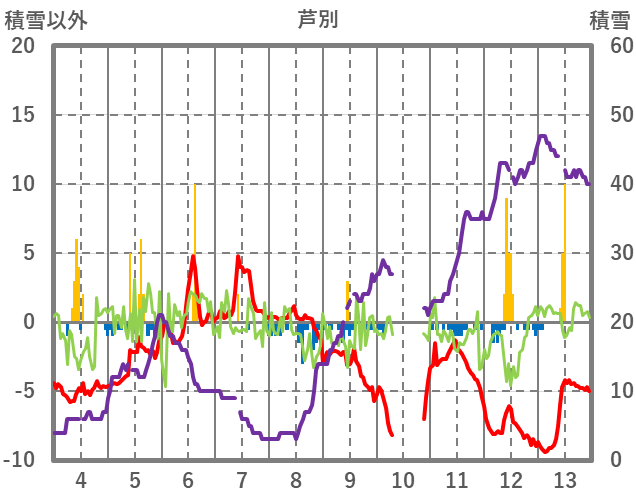 | 日 | 時 | 気温 | 降水 | 風向/風速 | 日照 | 積雪 | 降雪 |