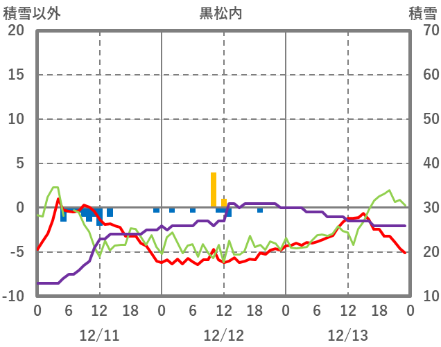 | 日 | 時 | 気温 | 降水 | 風向/風速 | 日照 | 積雪 | 降雪 |