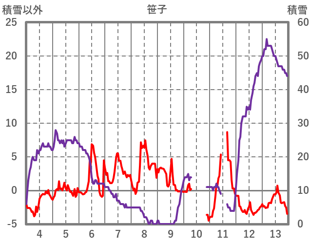 | 日 | 時 | 気温 | 降水 | 風向/風速 | 日照 | 積雪 | 降雪 |