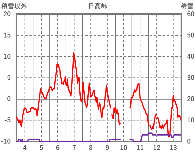 | 日 | 時 | 気温 | 降水 | 風向/風速 | 日照 | 積雪 | 降雪 |