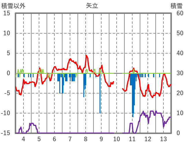 | 日 | 時 | 気温 | 降水 | 風向/風速 | 日照 | 積雪 | 降雪 |