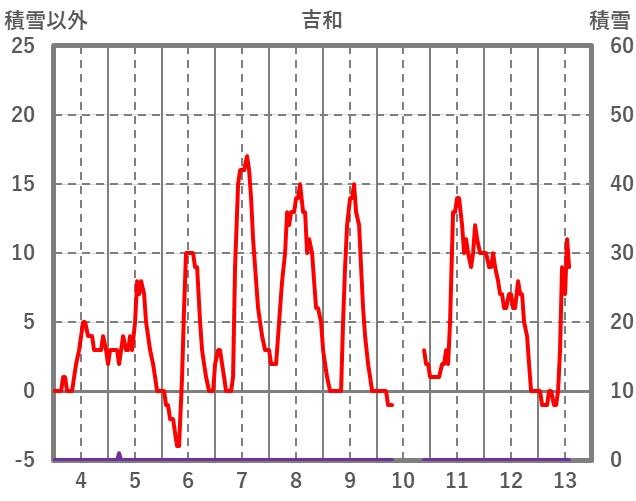 | 日 | 時 | 気温 | 降水 | 風向/風速 | 日照 | 積雪 | 降雪 |
