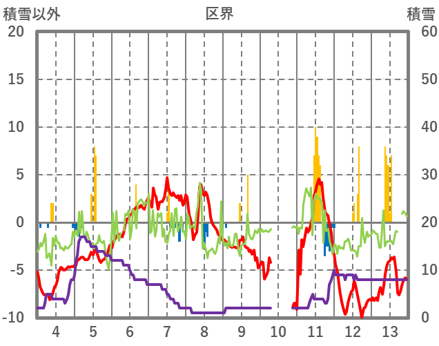 | 日 | 時 | 気温 | 降水 | 風向/風速 | 日照 | 積雪 | 降雪 |
