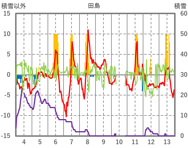 | 日 | 時 | 気温 | 降水 | 風向/風速 | 日照 | 積雪 | 降雪 |