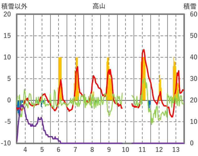 | 日 | 時 | 気温 | 降水 | 風向/風速 | 日照 | 積雪 | 降雪 |