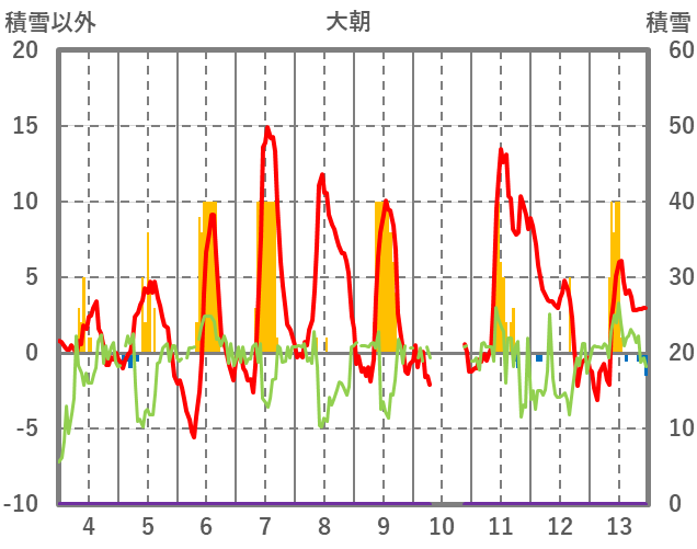 | 日 | 時 | 気温 | 降水 | 風向/風速 | 日照 | 積雪 | 降雪 |