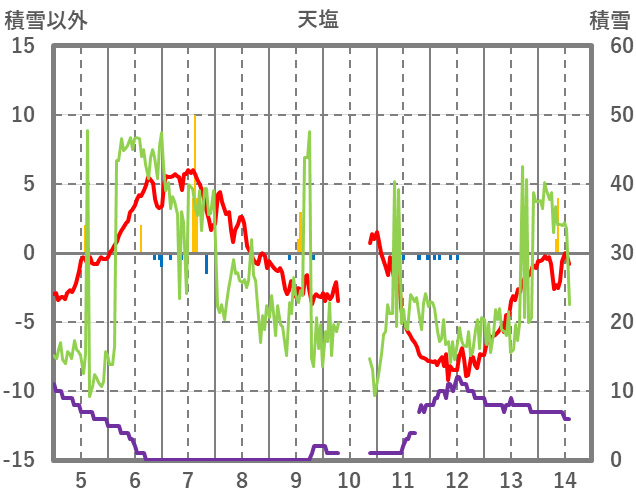 | 日 | 時 | 気温 | 降水 | 風向/風速 | 日照 | 積雪 | 降雪 |