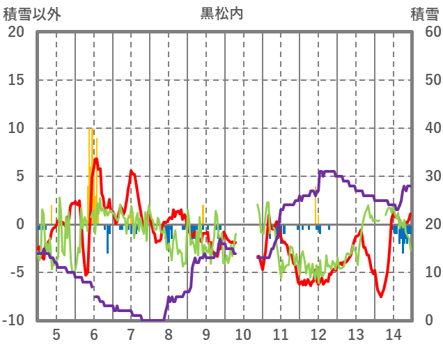 | 日 | 時 | 気温 | 降水 | 風向/風速 | 日照 | 積雪 | 降雪 |