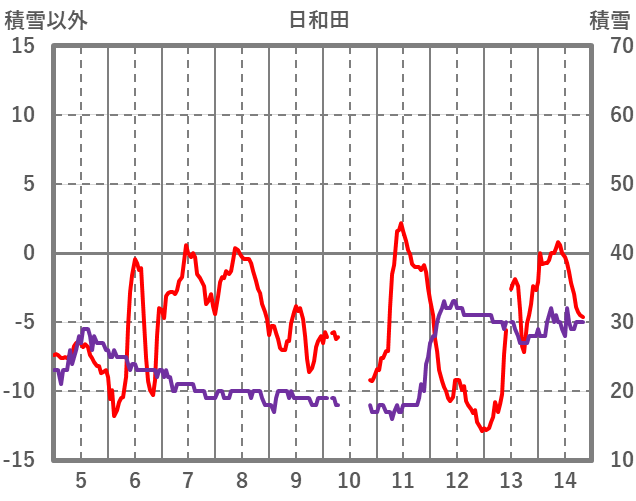 | 日 | 時 | 気温 | 降水 | 風向/風速 | 日照 | 積雪 | 降雪 |
