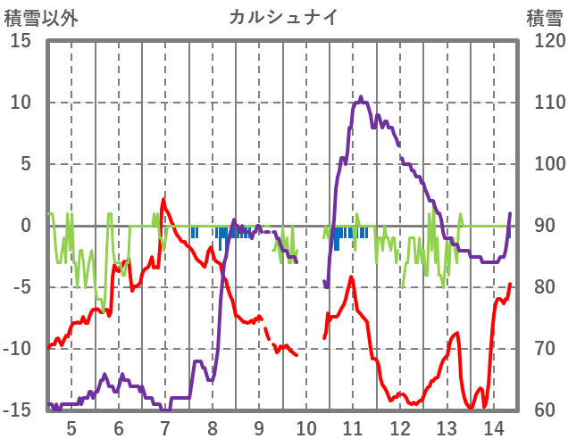 | 日 | 時 | 気温 | 降水 | 風向/風速 | 日照 | 積雪 | 降雪 |