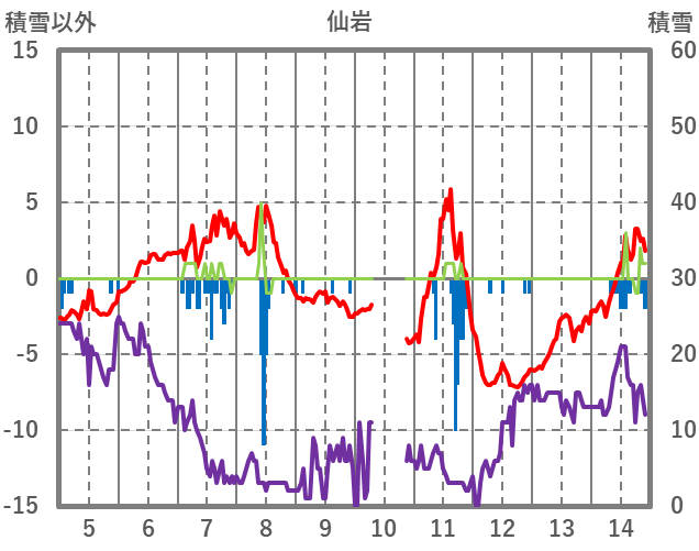 | 日 | 時 | 気温 | 降水 | 風向/風速 | 日照 | 積雪 | 降雪 |