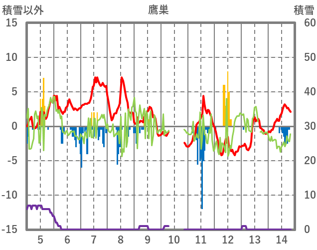 | 日 | 時 | 気温 | 降水 | 風向/風速 | 日照 | 積雪 | 降雪 |