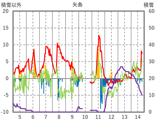 | 日 | 時 | 気温 | 降水 | 風向/風速 | 日照 | 積雪 | 降雪 |