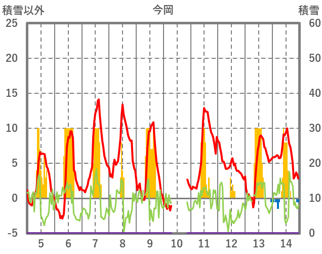 | 日 | 時 | 気温 | 降水 | 風向/風速 | 日照 | 積雪 | 降雪 |