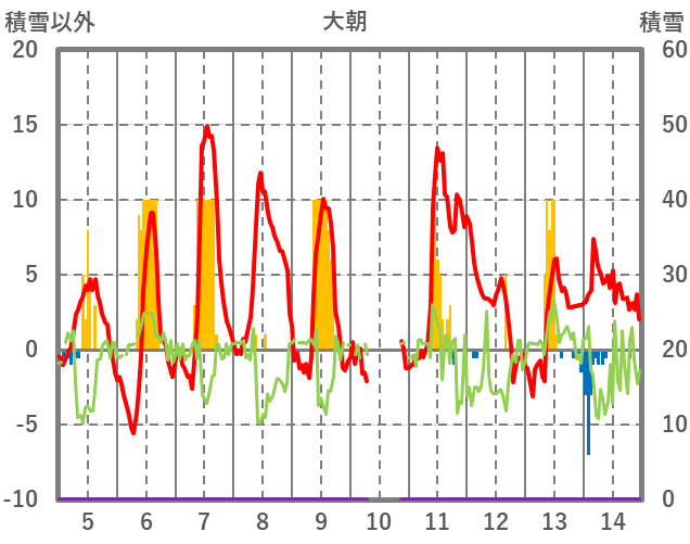 | 日 | 時 | 気温 | 降水 | 風向/風速 | 日照 | 積雪 | 降雪 |