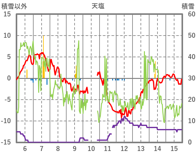 | 日 | 時 | 気温 | 降水 | 風向/風速 | 日照 | 積雪 | 降雪 |